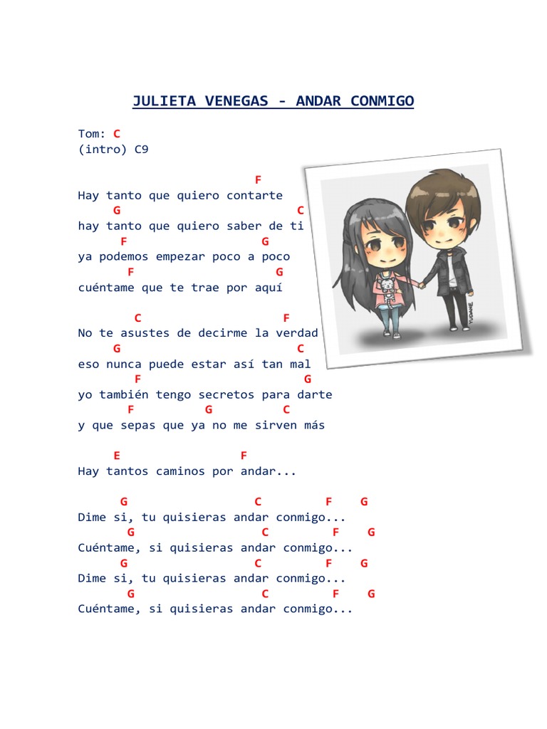Verse 1 F Hay tanto que quiero contarte G C hay tanto que quiero saber de ti F G ya podemos empezar poco a poco F G cuentame que te trae por aqui C F no te asustes de decirme la verdad G C eso nunca puede estar asi tan mal F G yo tambien tengo secretos para darte F G C y que sepas que ya no me sirven mas E F hay tantos caminos por andar Chorus G C F G Dime si tu quisieras andar conmigo. Choose and determine which version of Andar Conmigo chords and tabs by Julieta Venegas you can play. ChordTablature lyric sheet guitar ukulele song.