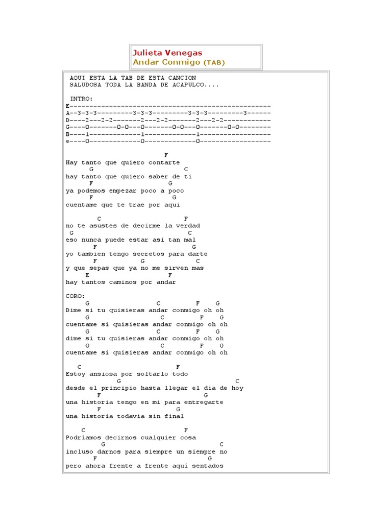 34449 views added to favorites 1022 times. Andar Conmigo Julieta Venegas Letras Acordes y Tabs para Guitarra Bajo y Ukulele. Andar Conmigo Julieta Venegas.